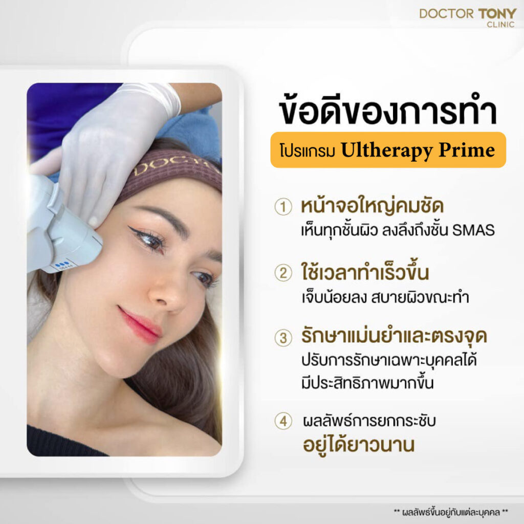 โปรแกรม Ulthera Prime เป็นเทคโนโลยีการยกกระชับผิวโดยไม่ต้องผ่าตัด ซึ่งใช้พลังงานคลื่นเสียงอัลตราซาวด์แบบเฉพาะเจาะจง ลงไปกระตุ้นการสร้างคอลลาเจนในระดับลึกถึงชั้น SMAS (Superficial Musculoaponeurotic System) ซึ่งเป็นชั้นเดียวกับที่ศัลยแพทย์ใช้ในการผ่าตัดดึงหน้า